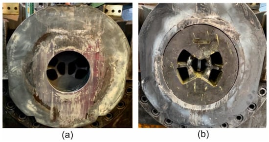 Porthole extrusion dies used in experimental trials of the extrusion of tubes of Ø50 × 2 mm from aluminum 7021 alloy 2 by using the 7-inch 2500 T hydraulic press: (a)—die 1; (b)—die 2.
