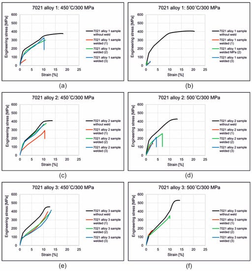 Stress–strain curves recorded during static tensile testing of samples welded from alloys 1, 2 and 3 at 450 °C and 500 °C; 7021 alloy 1: welding temperature 450 °C/welding pressure 300 MPa (a) 7021 alloy 1: welding temperature 500 °C/welding pressure 300 MPa (b) 7021 alloy 2: welding temperature 450 °C/welding pressure 300 MPa (c) 7021 alloy 2: welding temperature 500 °C/welding pressure 300 MPa (d) 7021 alloy 3: welding temperature 450 °C/welding pressure 300 MPa (e) 7021 alloy 3: welding temperature 500 °C/welding pressure 300 MPa (f).