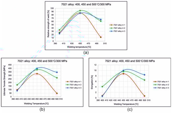 Figure 9 shows the stress–strain curves recorded during static tensile testing of samples welded from alloys 1, 2 and 3 at 450 °C and 500 °C. The influence of the welding temperature on the mechanical properties of the welds produced in the weldability tests at a given unit pressure p = 300 MPa for 7021 alloys with different contents of Mg and Zn (7021 alloy 1, 2 and 3) was determined (Figure 10). The highest strength and plastic properties were recorded at a welding temperature of 450 °C for all three analyzed alloys. The relative strength of the welds was 86% (alloy 1), 93% (alloy 2) and 85% (alloy 3). Slightly lower values of the relative strength of the welds were obtained for a welding temperature of 500 °C—but only for 7021 alloys 2 (61%) and 3 (66%). In the case of alloy 1, the relative strength of the welds dropped dramatically from 86% to 12%.