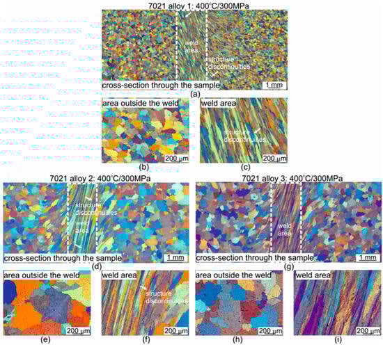 Microstructure of welded 7021 alloy in relation to chemical composition; welding was performed under identical process parameters: T = 400 °C, p = 300 MPa; (a–c) 7021 alloy 1: 1.20% Mg, 5.27% Zn; (d–f) 7021 alloy 2: 2.12% Mg, 5.47% Zn; (g–i) 7021 alloy 3: 2.12% Mg, 8.02% Zn; light microscopy.