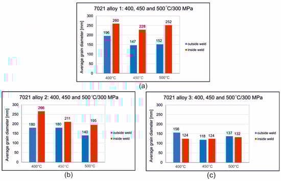 Average grain size outside and inside the weld; (a) 7021 alloy 1: 1.20% Mg, 5.27% Zn; (b) 7021 alloy 2: 2.12% Mg, 5.47% Zn; (c) 7021 alloy 3: 2.12% Mg, 8.02% Zn.