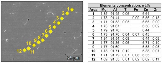 Figure 13 and Figures S3 and S4 in Supplementary File) show the results of the chemical composition analysis in micro-areas for alloy 2—welding at 450 °C (Figure 13: outside weld and Figure S3 in Supplementary File: in weld) and 500 °C (Figure S4 in Supplementary File: outside weld and Figure S5 in Supplementary File: in weld). Figure 14 shows the Mg content for the alloys tested when welded at 450 °C (Figure 14a) and 500 °C (Figure 14b). Figure S6 in Supplementary File, in turn, shows the Zn content for all alloys welded at 450 °C and 500 °C (Figure S6 in Supplementary File). The mean Mg and Zn content for samples welded at 450 °C was comparable in the welding and non-welding areas and averaged 1.75 wt.%. Mg and 6.5 wt.%. Zn (Figure 14a,b). Examination of the chemical composition of the grain cross-section locally indicates the presence of Ti and Zr, with these elements being present in the dispersoids observed inside the grains. Similarly, in samples welded at a higher temperature of 500 °C, the average content of Mg and Zn in the welding area and outside the weld was comparable, being higher than in samples welded at 450 °C and averaging 1.79 wt.% Mg and 6.56 wt.%, Zn (Figures S5 and S6 in Supplementary File).