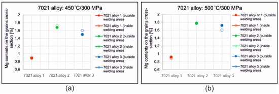 Average Mg content on the grain cross-section in the welding area and outside the welding area for the 7021 alloy 2 tested: (a) T = 450 °C, p = 300 MPa; (b) T = 500 °C, p = 300 MPa.