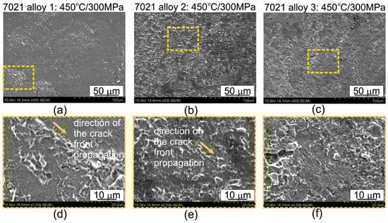 Fracture surfaces after uniaxial the tensile test; welding was performed under identical process parameters: T = 450 °C, p = 300 MPa; (a,d) 7021 alloy 1: 1.20% Mg, 5.27% Zn; (b,e) 7021 alloy 2: 2.12% Mg, 5.47% Zn; (c,f) 7021 alloy 3: 2.12% Mg, 8.02% Zn. Figures (d–f) are the enlarged areas indicated by the dashed rectangles in Figures (a–c).