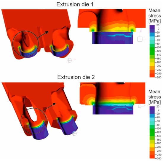 Distribution of mean stress during extrusion of tubes of Ø50 × 2 mm from 7021 aluminum alloy through porthole dies of different geometries—extrusion die 1 and extrusion die 2 (results of FEM calculations).