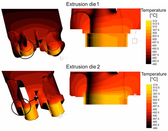 Distribution of temperature during extrusion of tubes of Ø50 × 2 mm from 7021 aluminum alloy through porthole dies of different geometries—extrusion die 1 and extrusion die 2 (results of FEM calculations).