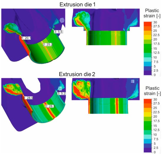 Distribution of plastic strain during extrusion of tubes of Ø50 × 2 mm from 7021 aluminum alloy through porthole dies of different geometries—extrusion die 1 and extrusion die 2 (results of FEM calculations).