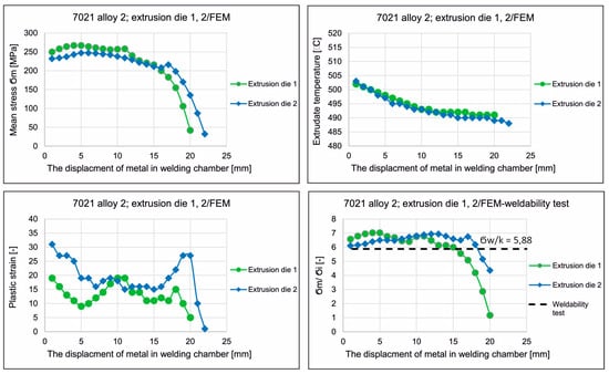 FEM numerically predicted the relationship between the displacement of metal in the welding chamber and the mean stress σm, extrudate temperature, plastic strain and weldability index σm/σi during extrusion of Ø50 × 2 mm tubes from 7021 aluminum alloy 2.
