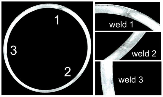 Example macrostructures of a tube of Ø50 × 2 mm extruded through die 1 from 7021 alloy 2 revealing the locations of welds in the cross-section.