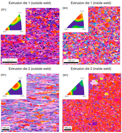Figure 22 shows the microstructures and analyses of the crystallographic orientation images taken from the cross-sectional view of the tube from the weld area and outside the weld area for die 1 and die 2. From observations in the weld area, it can be seen that the shape and grain size do not differ much from those outside the weld area. This is true for both die 1 and die 2 extruded tubes, and the differences are visible in the inverse-pole figure image. In samples taken from tubes extruded on die 1 and die 2, a maximum was found in the <001> direction, indicating an axial texture typical of the extruded products. Minor differences in texture blurring are also evident in the images in the sample taken from the extruded tube on die 1 between the weld and outside the weld. The image of the orientation distribution map in the sample extruded on die 2 differs from the others in local grain growth. At the weld area of this sample, recrystallized grains are visible, probably formed by friction processes during welding. The microstructure of the sample extruded on die 2 also differs in the shape of the grain outside the weld. The grains in this case are elongated.