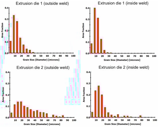 Grain size distributions for material outside the weld and inside the weld for tubes extruded by using die 1 and die 2 (tube of Ø50 × 2 mm extruded from 7021 alloy 2).