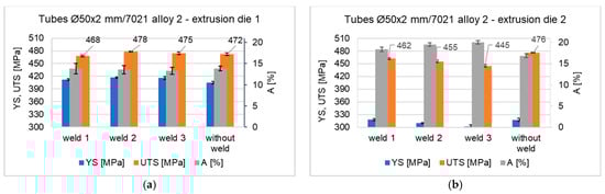 Mechanical properties of Ø50 × 2 mm tube extruded from 7021 alloy 2 through porthole die 1 (a) and porthole die 2 (b) determined in the static tensile test.