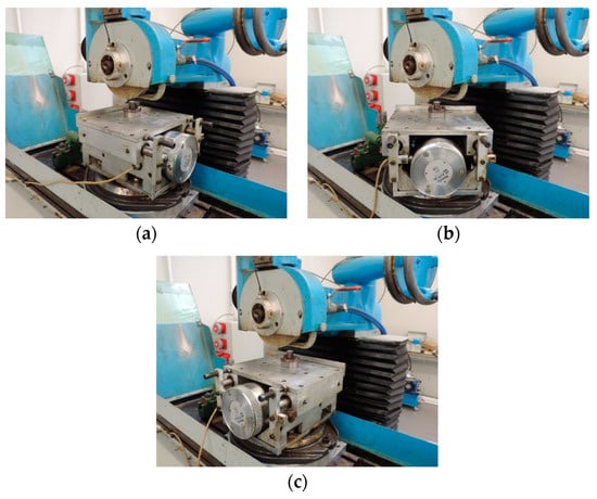 Orientation of the oscillating table on the grinding table: (a) angle 0°—direction of vibrations introduced parallel to the longitudinal feed vector of the grinding table; (b) angle 45°—direction of vibrations introduced at an angle of 45° to the longitudinal feed vector of the grinding table; (c) angle 90°—direction of vibrations introduced perpendicular to the longitudinal feed vector of the grinding table and at the same time parallel to the axis of the grinding wheel spindle.