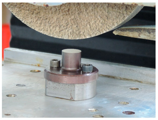 The tests were conducted on specimens with a specially designed shape, a circular specimen with a diameter smaller than the width of the grinding wheel (Figure 4), made from C45 structural steel hardened to 54 HRC hardness.