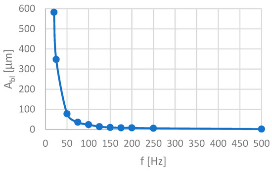 To determine the amplitude of vibrations introduced into the surface grinding process using an oscillating table, it was necessary to develop its amplitude–frequency characteristics. Figure 5 shows the amplitude–frequency characteristics of an oscillating table set into vibration with an electrodynamic vibration inductor, modelPR 9270/01 from Philips. It made it possible to determine the maximum peak-to-peak amplitudes Abl, expressed in micrometers for the 20 to 500 Hz frequency range of the vibration inductor.
