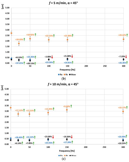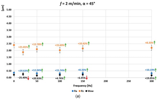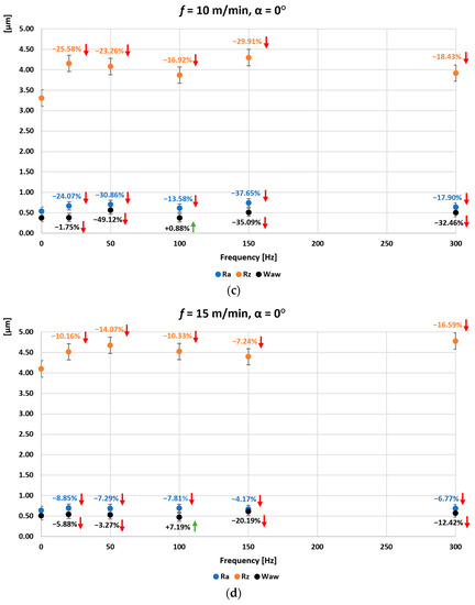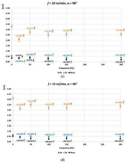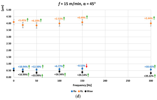 Figure 6, Figure 7 and Figure 8 show the average values of the Ra, Rz and Waw parameters measured for the surface of the ground C45 steel specimen obtained when grinding without introduced vibrations (0 Hz) and when grinding with introduced vibrations of 20, 50, 100, 150, and 300 Hz. In addition, the direction of the introduced vibrations was changed during the experimental tests. Additional vibrations were introduced for angle 0°, in which the direction of the introduced vibrations was parallel to the longitudinal feed vector of the grinding table (Figure 6), for angle 45°, the direction of the introduced vibrations at an angle of 45° to the longitudinal feed vector of the grinding table (Figure 7) and for angle 90°, the direction of the introduced vibrations perpendicular to the longitudinal feed vector of the grinding table and at the same time parallel to the axis of the grinding wheel spindle (Figure 8). The longitudinal feed rate of the grinding table was also changed. The graphs marked (a) were obtained with the longitudinal feed of the grinding table f = 2 m/min, (b) f = 5 m/min, (c) f = 10 m/min, and (d) f = 15 m/min. Arrows showing the percentage change for a given surface condition parameter in relation to the initial value, i.e., obtained without input vibration, are also presented on the individual graphs. Arrows in red indicate deterioration of the surface condition, and arrows in green indicate improvement of the surface condition obtained after grinding with vibrations.