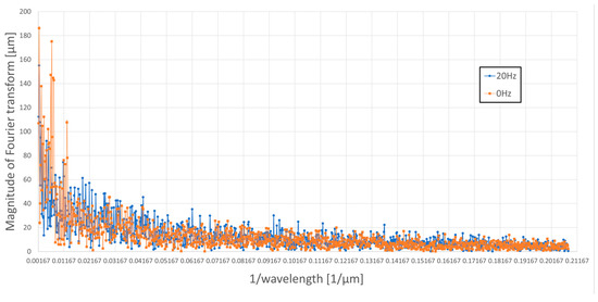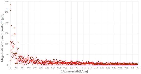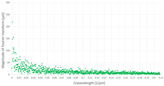 Figure 9 and Figure 10 present the results of Fourier analysis of the profile from a workpiece ground without oscillations (Figure 9) and the profile from a workpiece ground with axial oscillations (introduced perpendicular to the direction of table movement) with a frequency of 20 Hz and a peak-to-peak amplitude of c.a. 600 µm (Figure 10). Figure 11 summarizes the results of Fourier analysis for both of these cases in the range in which the introduced workpiece oscillations interacted, i.e., for wavelengths smaller than the peak-to-peak amplitude of the 600 µm oscillations (from 0.00167 to 0.2082 µm−1).