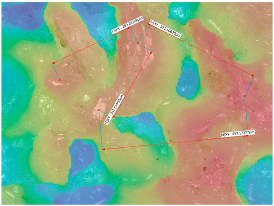 In the case of the tests carried out, an abrasive wheel from Saint-Gobain with the designation 38A60G12VBE-33 was used. The abrasive grain size of this wheel is about 300 µm. This information was verified by structure images taken with a Keyence VHX-950F series digital microscope. The images were obtained by compiling individual images with different focus positions. Figure 12 shows one of the measurements taken from an image of the grinding wheel. The distances between adjacent abrasive grains were determined to be close to 300 µm.