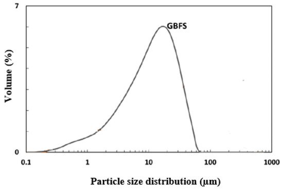 The blast furnace slag used in this study was provided by Fos, France. The chemical composition of the ground granulated blast furnace slag (GGBFS) is described in Table 1. The median particle size of the GGBFS was 10 µm, its density was 2.90, its activity index was 1 at 28 days, and its specific surface area was 0.45 m2/g, as determined by N2 sorption through the Brunauer–Emmett–Teller (BET) method. Its particle size distribution is presented in Figure 1.