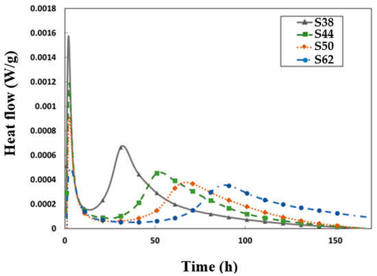 In Figure 2, the evolution of heat release in slag-based grouts is presented at various H2O/Na2O ratios. The heat flow was assessed using isothermal calorimetry and standardized based on the mass of the grout (the total mass of the mixture). Additionally, we attempted to normalize it with respect to the mass of the slag to investigate the impact of dilution on slag reactivity. The resulting curves showed no significant influence of water-to-solid on the cumulated heat release. Therefore, the data are presented relative to the overall mass of the grout. The impact of the ratio on the heat flux is significant. The intensity of the initial peak decreases with the water content, and the ‘dormant period’ extends as the medium is diluted. This stage occurs between particle dissolution and gel growth. Subsequently, the main peak is observed, corresponding to the maximum of the silicate reaction. Increasing the H2O/Na2O ratio delayed this peak, indicating that this ratio had a direct effect on the progress and formation of hydration reaction products in these grouts.