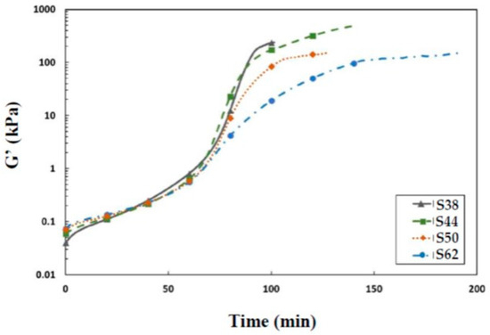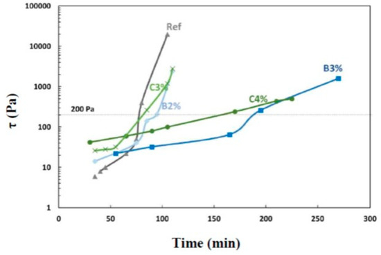 In Figure 8, the scissometer is used to monitor the stiffness of different mixtures. The use of acids boosted the initial stiffness rate when compared to reference mixture S38. However, increasing the percentage of additives in the blend eventually slowed down the development of the stiffness. If the stiffness threshold of 200 Pa is taken into consideration, the open time can be extended from 80 min to 185 min by adding 3% of boric acid (B3%) compared to the reference mixture. The gel time determined from the scissometer is represented in Table 3. Nonetheless, relying solely on the scissometer stiffness rate may not be the most appropriate way to assess the material structure since it only provides discontinuous characterization. These data do not allow us to understand the phenomena occurring when the material shifts from the fresh state to the hardening stage. Additionally, the test is destructive, requiring the fabrication of a significant amount of grout. For each measurement time, a separate sample is needed. Therefore, it is useful to study the impact of both additives on material structuring by employing oscillatory rheology.