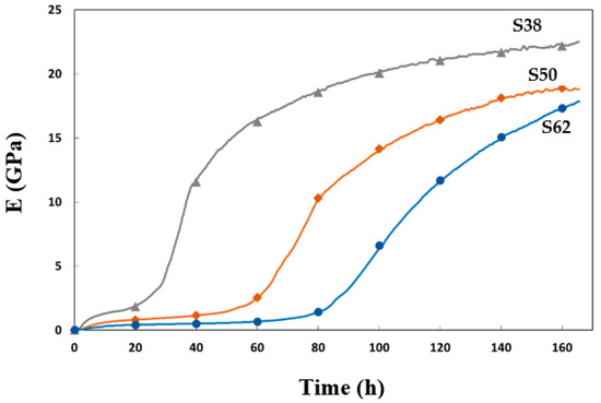 In order to establish a correlation between the mechanical properties at an early age and the reaction chemistry, Young’s modulus E was determined using the FreshCon method, as illustrated in Figure 4. In all the cases, the setting process is initiated rapidly after the constituents are mixed, followed by a pseudo-plateau in Young’s modulus and then a second acceleration that coincides with the onset of the second calorimetry peak (Figure 5). The evolution of Young’s modulus was more pronounced in S38. This mixture led to a higher modulus compared to other materials, which also exhibited some variations in modulus values and setting times. Notably, an increase in the H2O/Na2O ratio resulted in longer setting times and a prolonged constant plateau phase. By integrating heat flow and modulus measurements, a correlation between the physicochemical mechanisms is revealed, as presented in Figure 5.