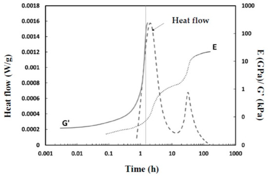 Time evolution of heat flow and Young’s modulus E and G′ of the S38 mixture.