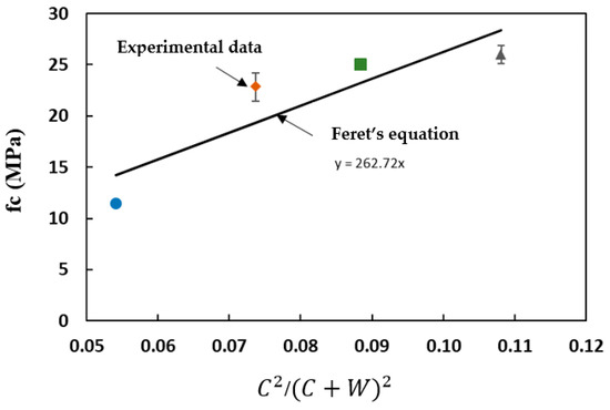 Comparison of experimental compressive strengths and values calculated by Feret’s equation at 28 days. Blue circle: S62. Red diamond: S50. Green square: S44Green triangle: S38.