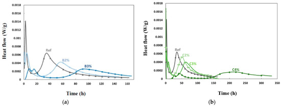 Two sets of retarders were tested for the L38 grout (Ref): boric acid at 2% (B2%) and 3% (B3%) and citric acid at 2% (C2%), 3% (C3%), and 4% (C4%), relative to the mass of slag in the mix. The reaction of the slag and activation solution undergoes several stages, including dissolution, induction, acceleration, and deceleration [2]. The impact of additives on these stages can be observed in Figure 7. The addition of boric acid delayed the peaks observed for the reference grout and decreased their respective intensities while increasing their width (Figure 7a). The addition of citric acid delayed the main silicate peak. When using 3% and 4% citric acid and 3% boric acid, two consecutive peaks were observed, followed by an extended induction phase before the main silicate peak appeared. This demonstrates that the retarders influence the reaction advancement differently depending on their contents and compositions. The addition of 4% citric acid caused a higher delay in the reaction compared to other combinations. Despite a peak after 10 days, the heat emitted from the C4% mixture remained low, even after seven days. Citric acid did not stop the reaction completely but significantly slowed its advancement when compared to other combinations. The released heat indicates that acids have a significant impact on the advancement of the alkali-activated reactivity of slag.
