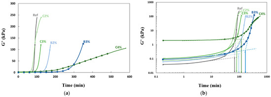 (a) Evolution of modulus G′ as a function of time (b) Determination of gel time.