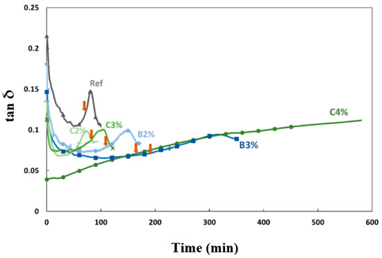 Figure 10 depicts the impact of structuring kinetics on the time-dependent evolution of tan δ. The loss tangent, tan δ, is defined as the ratio of the viscous modulus G″ to the elastic modulus G′ (tan δ = G″/G′). First, tan δ decreased because G′ varied more quickly than G″, and it was always lower than 1 (G′ > G″). A decrease in the loss factor can be attributed to the gradual gelation of the material [43], and then a peak in tan δ appeared. Several authors have mentioned that this peak presents a criterion of vitreous phase transition, which can be associated macroscopically with the gel time [9,24,35]. The value and time of this peak were influenced by the type and proportion of the retarder used, and the time of the tan δ peak increased with the acid content. The grout containing 4% citric acid manifests a longer time of the tan δ peak than the other mixtures, signifying that it maintained its viscoelastic state for a prolonged period and thus delayed the formation of a more solid network. The time corresponding to the peak in tan δ is compared to the gel time deduced from the scissometer measurements and oscillatory rheology in Table 3. The G′ curves were also used to define an indicator of the gel time. A rheometer would be a more convenient way to characterize the grout’s properties, as measuring the time with a scissometer required tracking multiple spots and using larger quantities of grout.