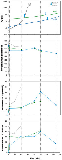 Evolution of G′ and concentration of Si, Al, and Ca.