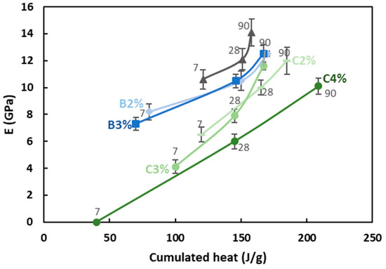 Evolution of elastic modulus E as a function of cumulated heat after 7, 28, and 90 days of curing.