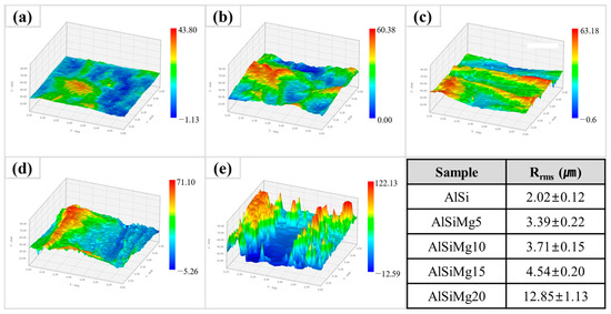 Three-dimensional (3D) surface topography of: (a) AlSi; (b) AlSiMg5; (c) AlSiMg10; (d) AlSiMg15; (e) AlSiMg20.