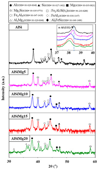 XRD was used to investigate the effects of the Mg content on the crystallographic properties of the Al–Si–xMg alloy coatings; the corresponding patterns are provided in Figure 5. All the samples predominantly contained the α-Al phase, with additional peaks corresponding to the Mg2Si phase observed in the patterns of all the Mg-added samples. Our findings revealed a noticeable shift in the peak associated with the (111) crystallographic plane of α-Al toward lower scattering angles. This shift indicates the presence of a solid solution of Mg atoms within the Al-matrix, fostering lattice expansion [41,42]. Peaks corresponding to the Fe2Al7Si (τ5), Al5FeSi, and Fe2Al5 alloy phases were observed in the XRD pattern of AlSi, whereas the XRD patterns of the Mg-added samples indicated Mg2Si formation and the transformation of the τ5 phase into the FeAl3 phase. Furthermore, the addition of Mg resulted in the disappearance of the Fe2Al7Si (τ5) and Al5FeSi phases. Notably, the AlSiMg20 pattern contained peaks corresponding to the Al3Mg2 phases, which is consistent with the SEM–EDS results (Figure 3 and Table 2).