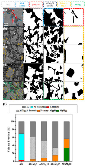 Surface microstructures of the samples with the different phase regions marked: (a) AlSi; (b) AlSiMg5; (c) AlSiMg10; (d) AlSiMg15; (e) AlSiMg20. (f) Volume-fraction plot of the samples.