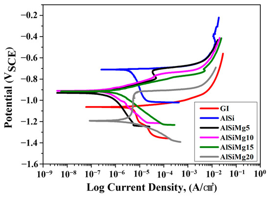 The potentiodynamic polarization plots of the Al–Si–xMg samples are shown in Figure 9, and the electrochemical corrosion parameters are listed in Table 5. Hot-dip galvanized (GI) steel sheets were also tested for comparison. A Zn coating layer (approximately 35 μm thick) was produced by immersing the substrate in a pure Zn pot at a temperature of 470 °C for 5 min. The corrosion rate (mpy) was calculated based on the corrosion current density (measured via the Tafel extrapolation method), as follows: