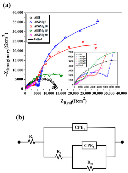 (a) Nyquist plots, (b) equivalent circuit used to fit EIS results of hot-dip Al–Si–xMg alloy coatings.