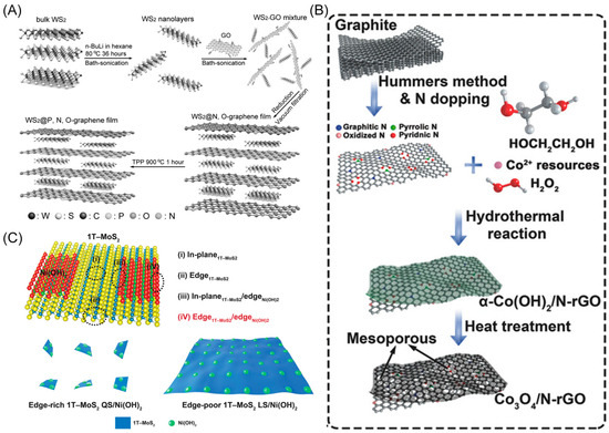 (A) Schematic illustration of the fabrication process of the WS2@P, N, O-graphene sheet. Reproduced with permission: Copyright 2015, Wiley-VCH [30]. (B) Schematic illustration of the synthesis process of the 2D Co3O4/N-rGO nanosheets for the knittable zinc–air batteries. Reproduced with permission: Copyright 2017, Wiley-VCH [31]. (C) Schematic illustration of four positions of active sites (upper), edge-rich 1T–MoS2 quantum sheets (QS)/Ni(OH)2 (bottom left) and edge-poor 1T–MoS2 large sheets (LS)/Ni(OH)2 (bottom right) catalysts. Reproduced with permission: Copyright 2020, Wiley-VCH [32].