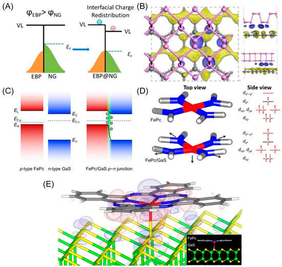 (A) Schematic illustration of electron transfer from NG to EBP and interfacial charge redistribution. (B) Schematic illustration of the specific charge density difference between NG and EBP, where the blue area represents electron-rich areas and the yellow area represents hole-rich areas. Reproduced with permission: Copyright 2019, American Chemical Society [29]. (C) Schematic illustration of electron transfer from GaS to FePc and interfacial charge redistribution. (D) The discrepancies of atomic structure (left) and electronic configuration (right) of the FeN4 moieties. It shows the distorted FeN4 moieties and electronic configuration in FePc/GaS (bottom) compared with pristine FePc (upper). (E) Schematic illustration of the charge density difference at the junction interface. The red area represents the electron accumulated area and the blue area represents the electron depletion area. Inset shows a side view of the structurally relaxed model of the junction. Reproduced with permission: Copyright 2022, Wiley-VCH [40].