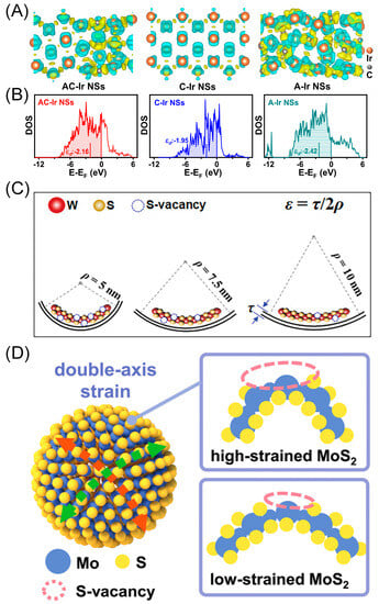 (A) The Bader charge density analysis results of AC-Ir NSs with 4% tensile strain (left), crystalline-Ir NSs (middle) and amorphous-Ir NSs (right), respectively. The cyan areas represent the charge depletion areas and the yellow represent the charge accumulation areas. (B) The PDOS plots showing the optimized d-band center of AC-Ir NSs with 4% tensile strain (the red one) among the three catalysts. Reproduced with permission: Copyright 2022, Springer Nature [56]. (C) Schematic illustration of S-vacancy density difference in WS2 nanosheets with various pore sizes. Reproduced with permission: Copyright 2020, Wiley-VCH [57]. (D) Schematic illustration of strain-induced S-vacancy generation mechanism in an MoS2 model. Reproduced with permission: Copyright 2022, Wiley-VCH [58].