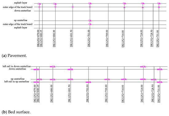The layers that were fitted with test sensors were, from the surface working downwards, the pavement, the bed surface, and the bottom of the bed. Many test sensors were embedded at the section DK1252 + 701 to investigate the dynamic behavior along the subgrade depth (see Figure 5c). It should be noted that the term “dynamic response” refers to the data collected from the bed surface layer in the following text, except for in the specialized study in the depth direction.