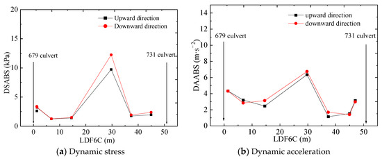 The changes in the dynamic responses according to the train’s running direction are shown in Table 6 and Figure 10. In terms of dynamic stress, the existence of culverts reduces the stressed area of the culvert bed, causing some stress to concentrate on the two culverts. Another important phenomenon is that the maximum stress differences and maximum acceleration differences appear at section DK1252 + 709 instead of the sections with culverts. When the train runs downward, the stress amplitude increases by 20.59% more than upwards; the acceleration amplitude increases by 32.24%. This infers that the vibration waves caused by the train are superposed to a peak after transferring, reflecting, and refracting in the transition section. Thus, we can conclude that the train’s running direction has an obvious impact on the section between the two culverts.