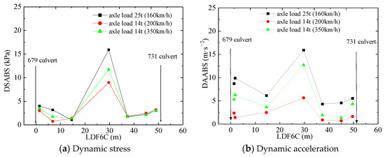 All the data were tested by the above experiment and analyzed by signal analysis methods. To make the description more concise, “679 culvert” is an abbreviation of “the middle of the culvert in the DK1252 + 679 section”. In the same way, DK1252 + 701 is the section that is 22 m from the 679 culvert, DK1252 + 709 is the section that is 30 m from the 679 culvert, and so on. Additionally, “731 culvert” is an abbreviation of “the middle of the culvert in the DK1252 + 731 section”. “LDF6C” is short for “the longitudinal distance from culvert DK679 to the small mileage direction”; “DRABS” is short for “dynamic response amplitude on bed surface”. “DFBS” is short for “depth from bed surface”, “upward direction” means the direction from small mileage to big mileage, and “downward direction” means the direction from big mileage to small mileage. Finally, it should be noted that “response” means “stress”, “acceleration”, “speed”, and “displacement”.