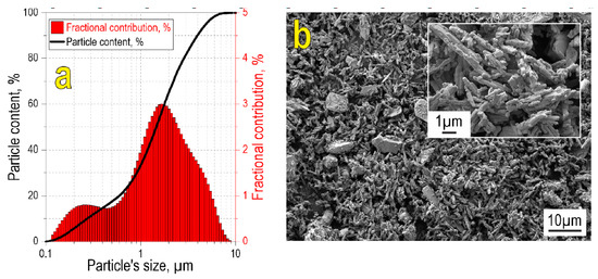 According to particle size analysis (Figure 1a), the initial oxide blend is characterized by a wide bimodal fractional distribution in the range 0.1–10 µm, with mean sizes 0.2 and 2 µm corresponding to the two modes. Particle size data are confirmed by SEM images, showing that the reactive powder blend possesses polydisperse size composition (Figure 1b), with the small-sized fraction consisting of needle-shaped particles. Large particles are relatively homogeneously distributed within the small particle fraction.