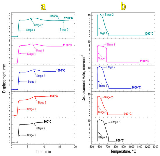 Based on the temporal and thermal evolution of SPS consolidation (Figure 2a,b), it was found that sintering proceeds in two stages regardless of the final sintering temperature. The first stage encompasses mechanical densification of powder particles and their partial deformation, rearrangement, and packing under constantly applied pressure. The second densification stage at 580–650 °C is a result of chemical interaction yielding the SrMoO4 phase and thermal consolidation of particles forming a dense compact. This stage manifests in the active atomic diffusion along the interparticle contacts, viscous flow, and particle plastic deformation, leading to overall material compaction. The sample sintered at 1200 °C observed a third densification stage, likely caused by the sublimation of molybdenum oxide at 1155 °C in accordance with references [41].