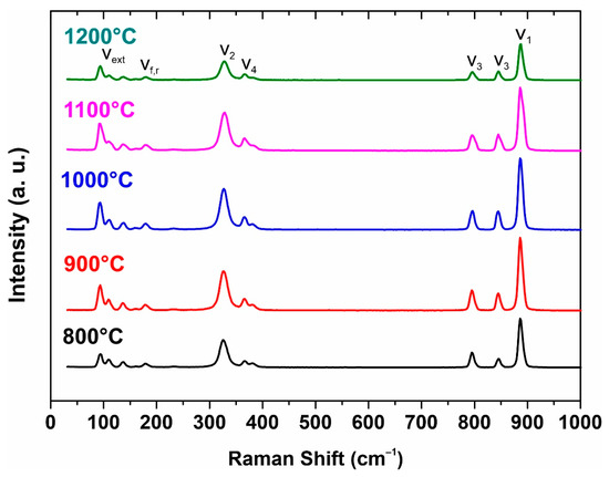 The structure of strontium molybdate has also been investigated by Raman spectroscopy (Figure 4). Raman spectra of molybdates include internal and external vibrational modes. Raman spectra of sintered SrMoO4 ceramic sample powders with ten observed and labeled vibrational modes are shown in Figure 4. The internal modes ν1, ν2, ν3, and ν4 are at 328, 365/366, 382, 796, 844, and 887 cm−1. The external modes are observed around 93–139 cm−1 and the free-spinning modes are observed at 182/179 cm−1, which is in agreement with the literature data.
