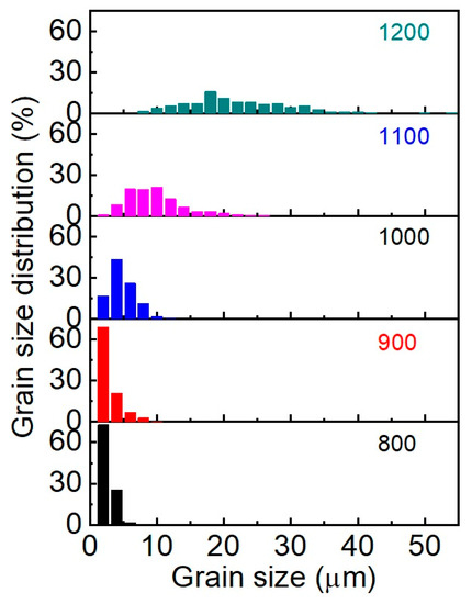 Grain size distribution of SrMoO4 SPS samples at 800–1200 °C.