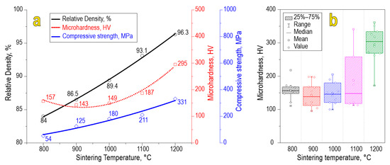 The physicochemical characteristics of the ceramics, namely, relative density (84.0–96.3%), compressive strength (54–331 MPa), and Vickers microhardness (157–295 HV), increase with the sintering temperature (Figure 7a). A scatter plot of Vickers microhardness allows us to assess the mechanical microheterogeneity of the material (Figure 7b). According to the data, we found that each sample observed some variation in microhardness values caused by anisotropy of the studied characteristics in local parts of the sample. The sample sintered at 1100 °C observed increased heterogeneity in terms of microhardness, which is likely caused by molybdenum oxide sublimation. However, the sample sintered at 1200 °C exhibited much higher values of microhardness, probably due to the formation of separate phases of SrO and MoO3, which act as alloying agents strengthening the ceramic particles. Also, the effect of consolidation at 1200 °C is maximal compared to lower temperatures, yielding ceramics of higher mechanical strength.