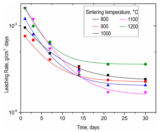 As-prepared SrMoO4 ceramics were subjected to hydrolytic stability tests in terms of strontium discharge. The strontium leaching rate for all samples was as low as 10−6 g/cm2·day (Figure 8). The ceramic sample obtained at 1200 °C was characterized by a higher strontium leaching rate, even compared to the sample sintered at 800 °C. This effect is caused by the change in phase composition due to molybdenum oxide sublimation, proven by XRD above (Figure 3). It is noteworthy that all leaching rate values meet the requirements of ISO 6961:1982 and GOST R 50926-96, indicating the high hydrolytic stability of ceramics.